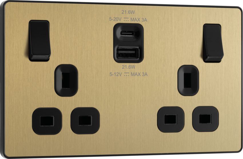BG's Evolve range a stylish, modern design, with screwless front plate that clips on and off, ideal for redecoration. Double Socket 13A with 22W Type A + C USB in Satin Brass. General Inform ... Read More