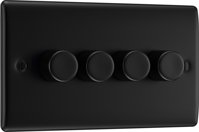 BG's Flatplate Screwless range a slimline design, easy to clip on and off and will add a modern finish to internal environments. 200W 4 Gang 2 Way Push Type Dimmer Switch in Matt Black ... Read More