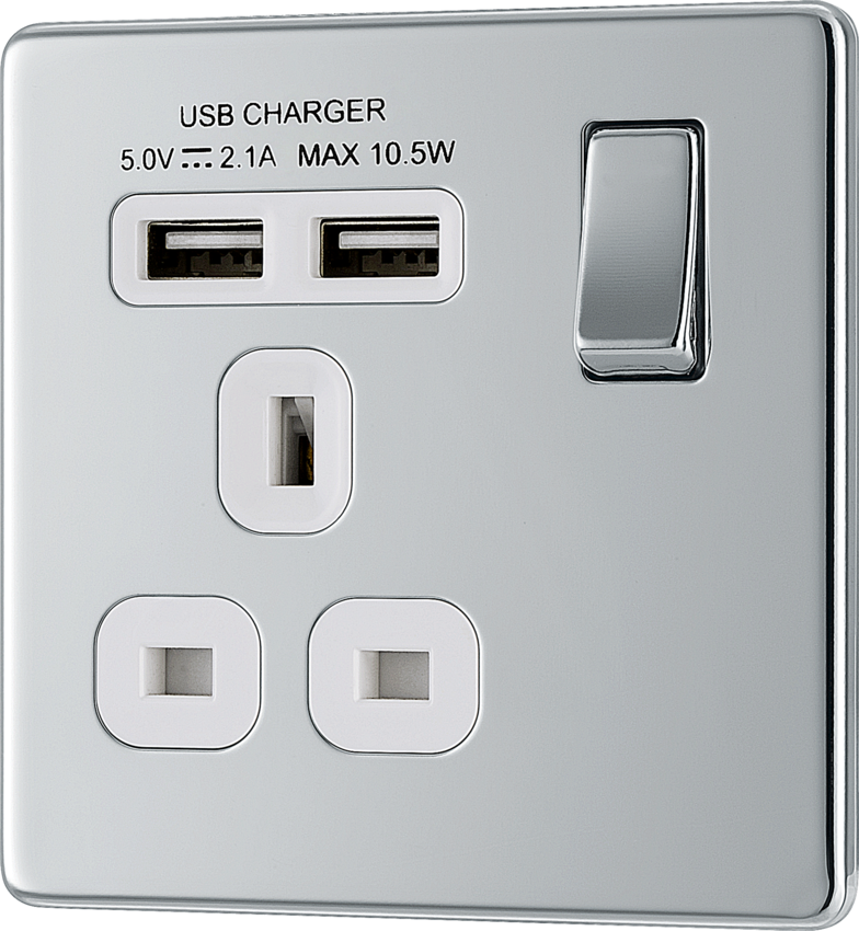 1 Gang 2USB 2.1A Switched Socket in Polished Chrome.