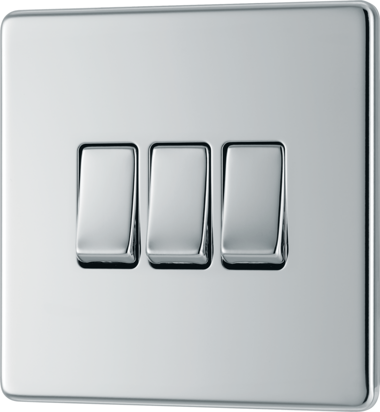 20A 3 Gang 2 Way Plate Switch in Polished Chrome.