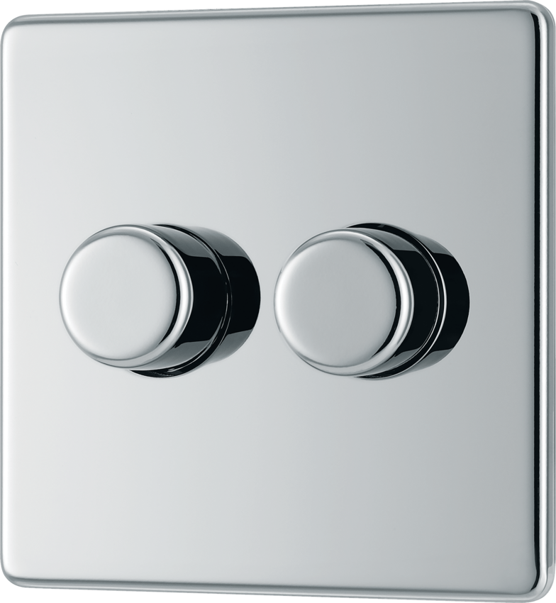 BG's Flatplate Screwless range a slimline design, easy to clip on and off and will add a modern finish to internal environments. 200W 2 Gang 2 Way Push Type Dimmer Switch in Polished C ... Read More