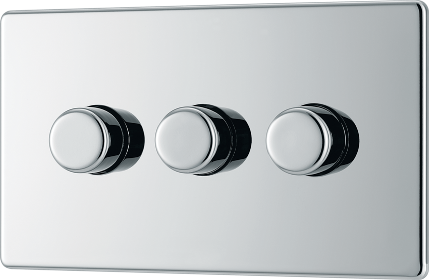 BG's Flatplate Screwless range a slimline design, easy to clip on and off and will add a modern finish to internal environments. 200W 3 Gang 2 Way Push Type Dimmer Switch in Polished C ... Read More