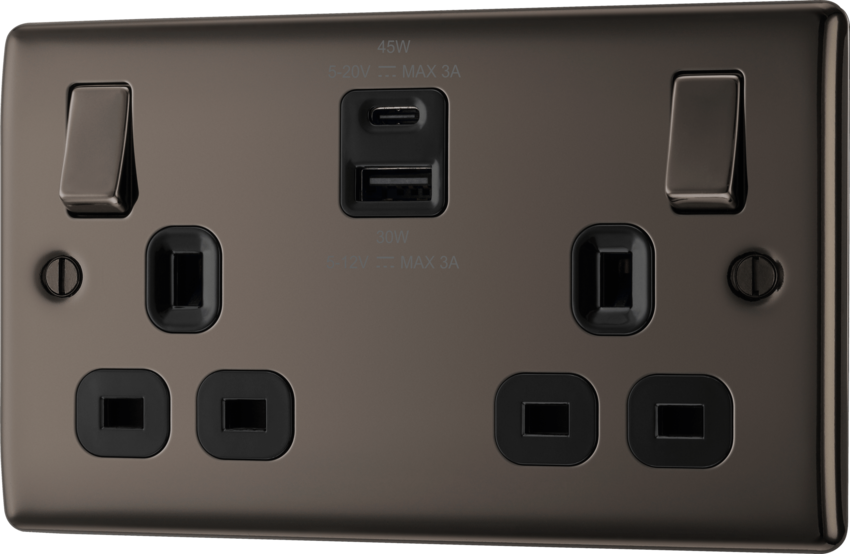 Double Socket 13A with 45W Type A + C USB in Black Nickel.