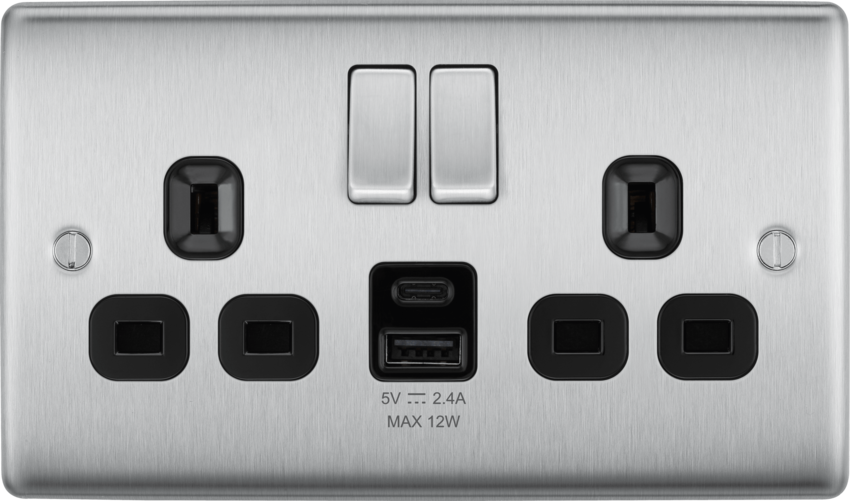 BG Nexus NBS22UAC12B Double Socket 13A with 12W Type A + C USB - Brushed Steel