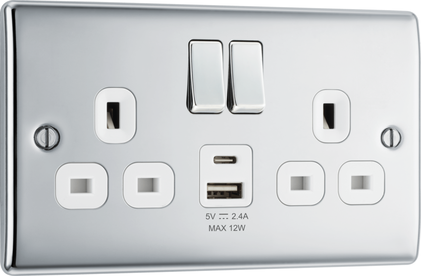 BG Nexus NPC22UAC12W Double Socket 13A with 12W Type A + C USB - Polished Chrome
