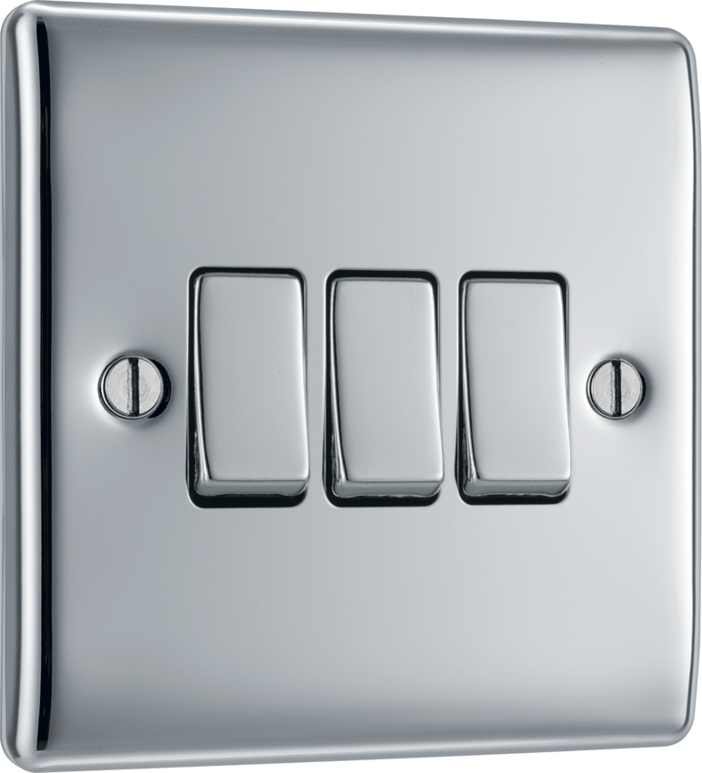 20A 3 Gang 2 Way Plate Switch in Polished Chrome.