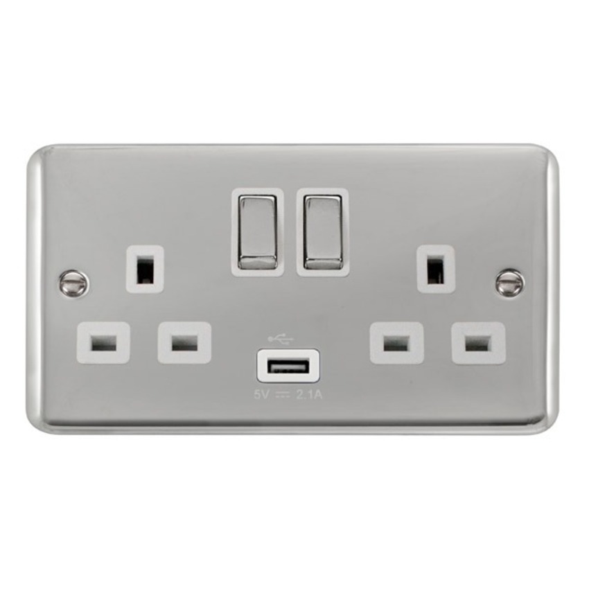 Polished Chrome 13A Ingot 2 Gang Switched Socket Outlet With Single 2.1A USB Outlet.
