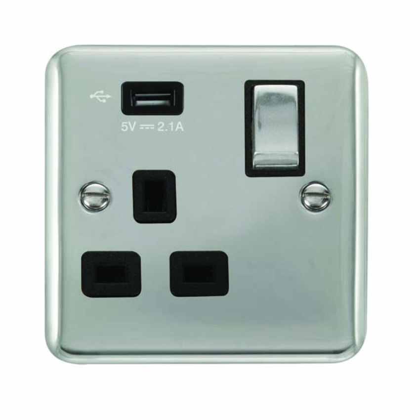 Polished Chrome 13A Ingot 1 Gang Switched Socket Outlet With Single 2.1A USB Outlet.