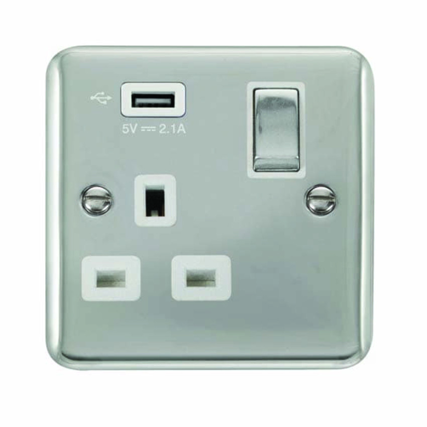 Polished Chrome 13A Ingot 1 Gang Switched Socket Outlet With Single 2.1A USB Outlet.