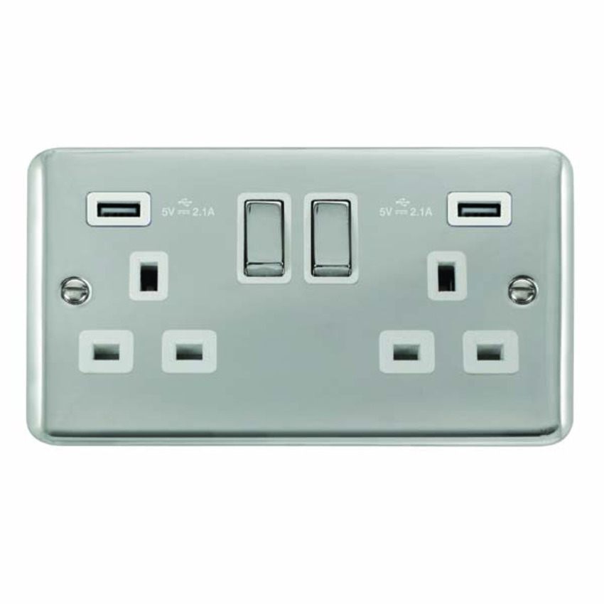 Polished Chrome 13A Ingot 2 Gang Switched Socket Outlet With Twin USB (Total 4.2A) Outlets.