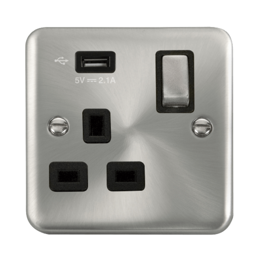 Satin Chrome 13A Ingot 1 Gang Switched Socket Outlet With Single 2.1A USB Outlet.