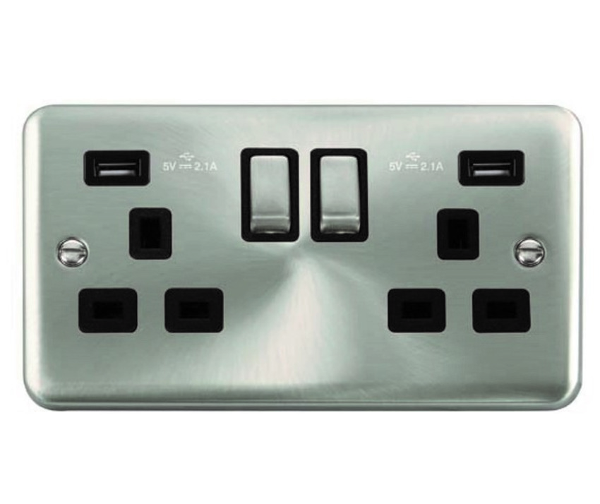 Satin Chrome 13A Ingot 2 Gang Switched Socket Outlet With Twin USB (Total 4.2A) Outlets.