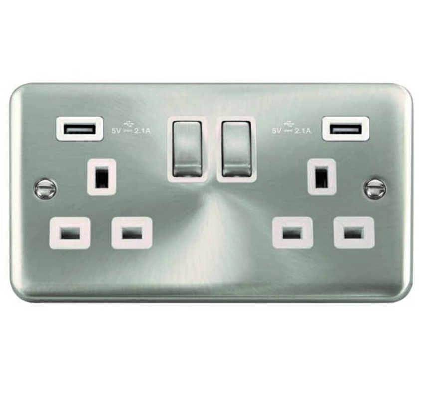 Satin Chrome 13A Ingot 2 Gang Switched Socket Outlet With Twin USB (Total 4.2A) Outlets.