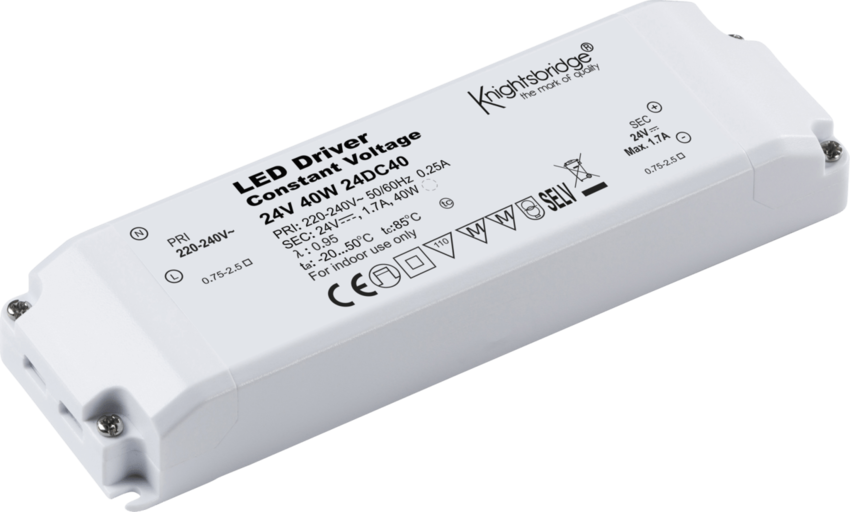 Knightsbridge 24V IP20 40W LED Driver - Constant Voltage. With open circuit, short circuit and overheat and overload protection.