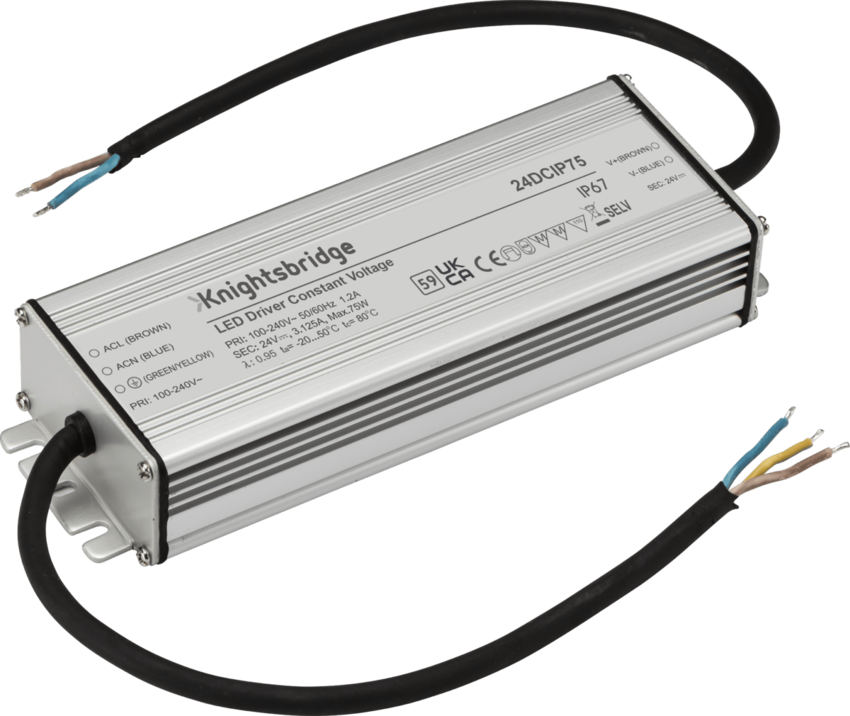Knightsbridge 24V IP67 75W DC LED Driver - Constant Voltage. General Information Dimensions: 35mm (H) x 67mm (W) x 199mm (L) Construction: Aluminium IP Rating: IP67 For indoor and outd ... Read More