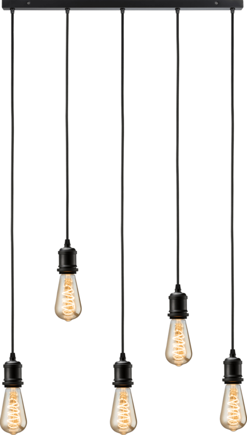 Knightsbridge's new Calla range, 5 light bar ceiling pendant with vintage style lamp holders. Each drop has 1.8m black fabric flex cable, where height can be adjusted independently. Fitting is stylish on its own or accompanied with filament lamps and cages/ shades, to create different look and style within a roomset.