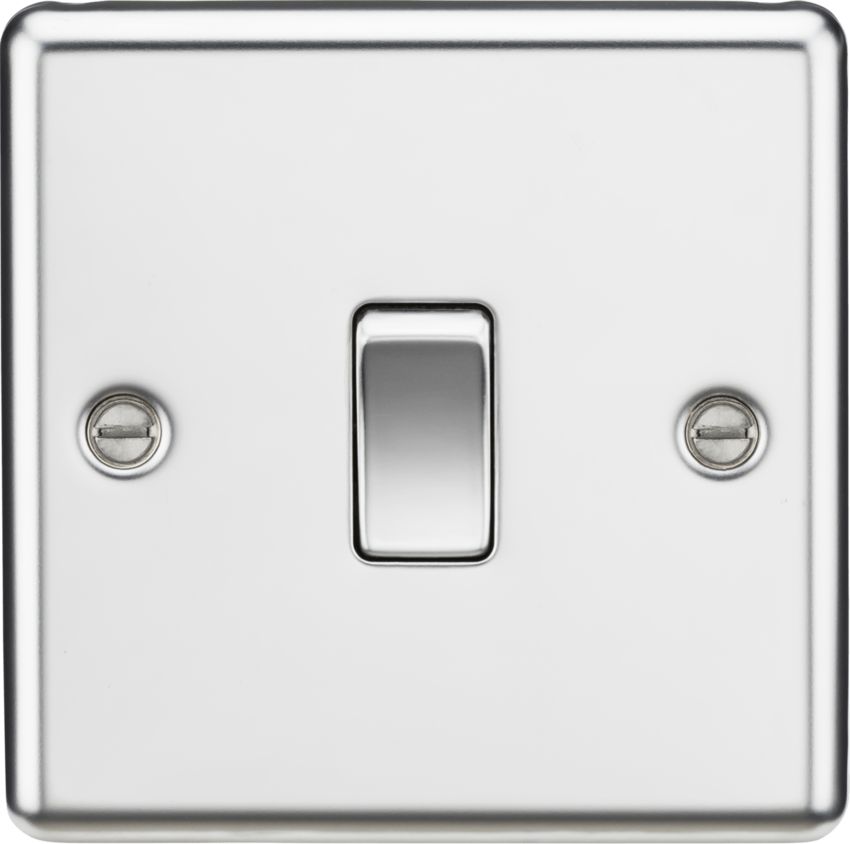 Knightsbridge's Rounded Edge Range, contemporary style with matching metal rocker switches. Moisture gasket built in to prevent moisture transfer from wall to plate, ensuring plate remains untarnished.