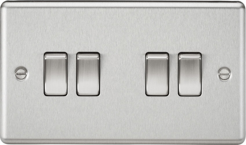 Knightsbridge's Rounded Edge Range, contemporary style with matching metal rocker switches. Moisture gasket built in to prevent moisture transfer from wall to plate, ensuring plate remains untarnished.