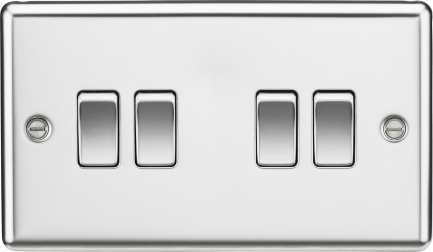Knightsbridge's Rounded Edge Range, contemporary style with matching metal rocker switches. Moisture gasket built in to prevent moisture transfer from wall to plate, ensuring plate remains untarnished.