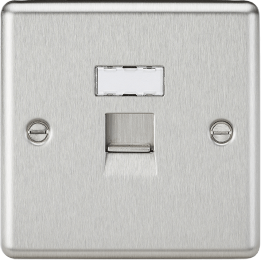 Knightsbridge's Rounded Edge Range, contemporary style with matching metal rocker switches. Moisture gasket built in to prevent moisture transfer from wall to plate, ensuring plate remains untarnished.