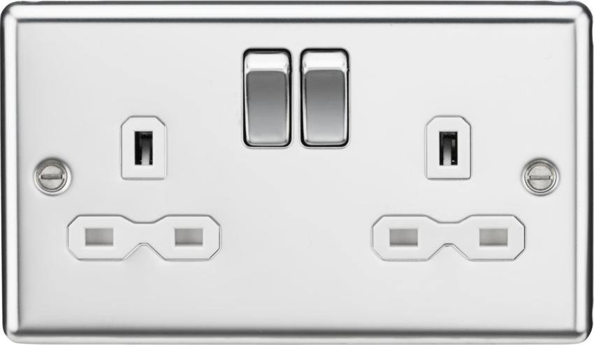 Knightsbridge's Rounded Edge Range, contemporary style with matching metal rocker switches. Moisture gasket built in to prevent moisture transfer from wall to plate, ensuring plate remains untarnished.