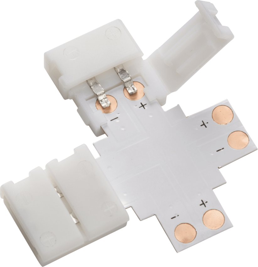 Knightsbridge's 12V / 24V LED flex 4 way X-connector - Single Colour. Comes with 4 connector brackets, with easy click connection.