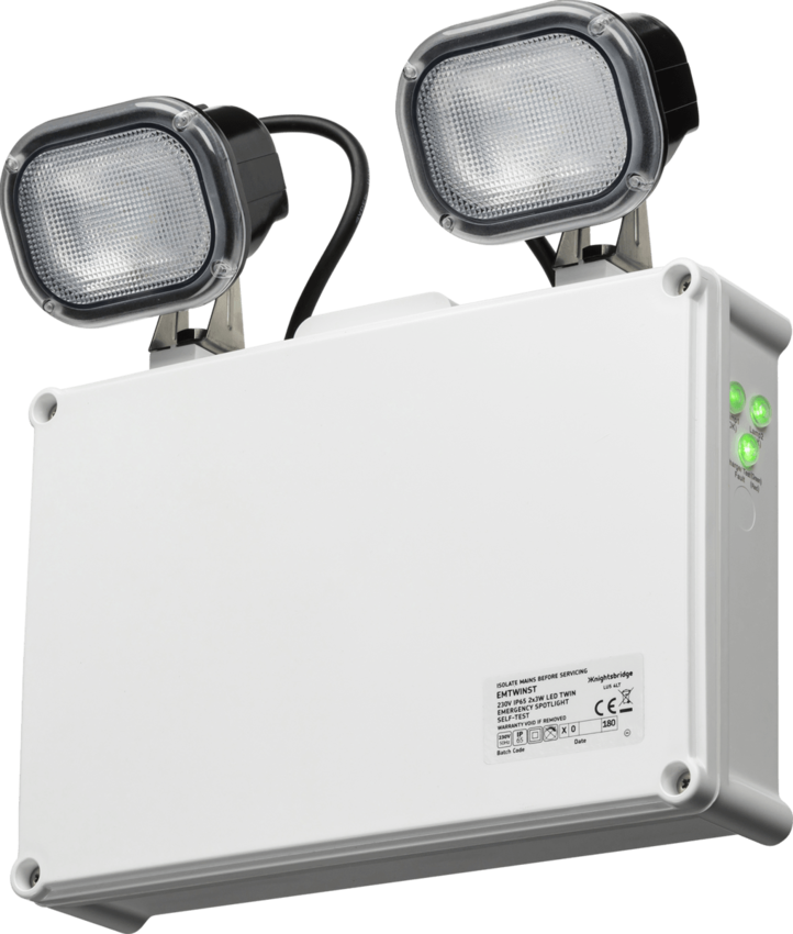 Knightsbridge LED Twin Emergency Spotlight. Integral auto test facility ensuring periodic testing at pre-programmed intervals. Long life, low maintenance emergency light source.