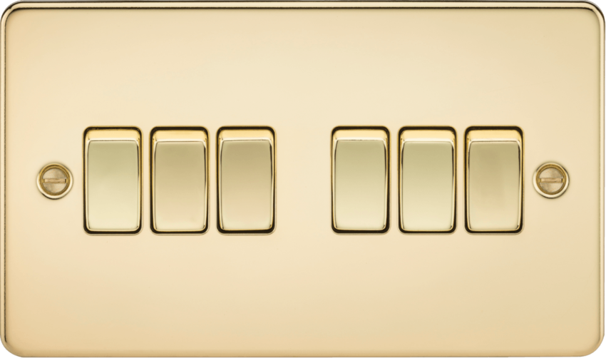 Knightsbridge's Flat Plate Range, an ultra slim profile design made from a high quality metal with matching rockers and a built in moisture gasket. 10AX 6 Gang 2 Way Switch. General Informat ... Read More