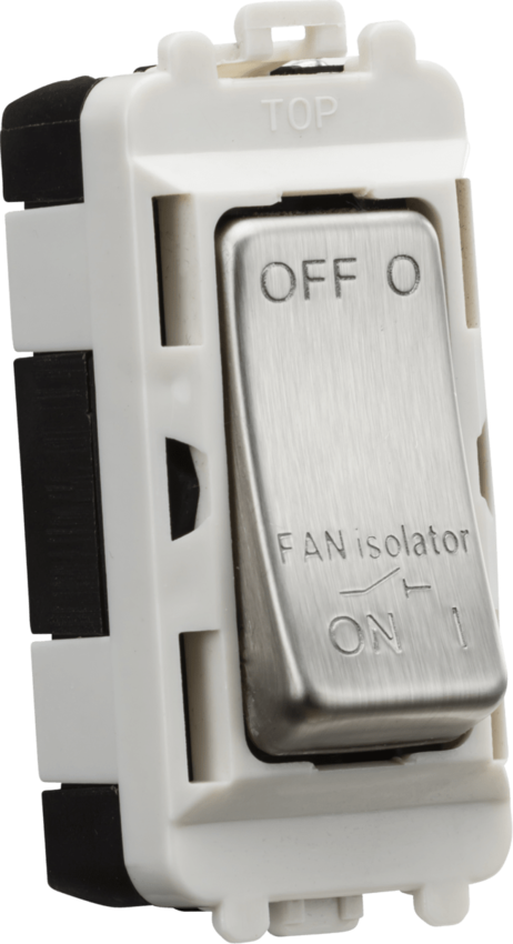 Knightsbridge Grid System. 10A Fan Isolator Module. General Information Plate Dimensions: 25mm (W) x 56.3mm (H) Projection: 7mm Recessed Depth: 12mm Min Mounting Box Depth: 25mm Finish: Brus ... Read More