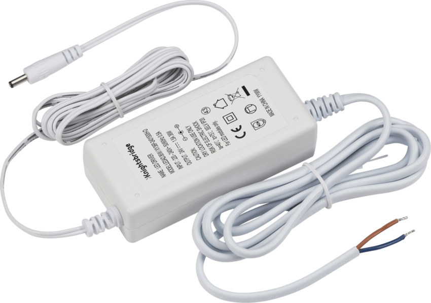 Knightsbridge Power adaptor. For use with most low voltage led cabinet and furniture luminaries requiring 24V Constant voltage power supply. For use with MLA UCL and LED under cabinet thin strip.