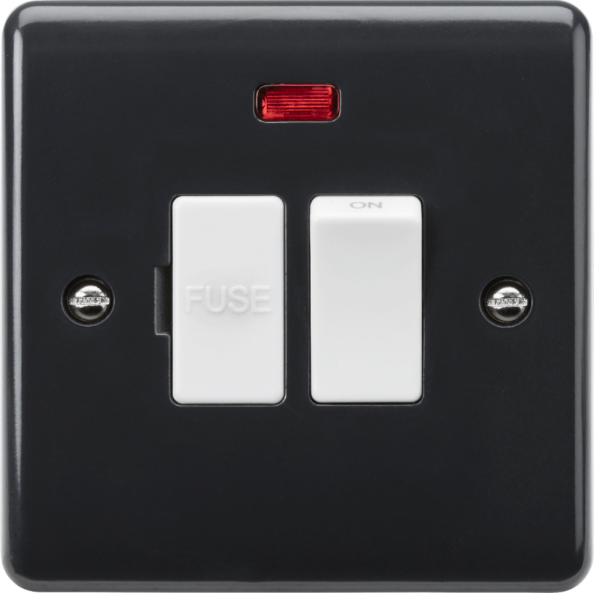 13A Switched Fused Spur with Neon and Flex Outlet from base. Slightly deeper plate depth to accommodate flex outlet from base (clamp on rear).