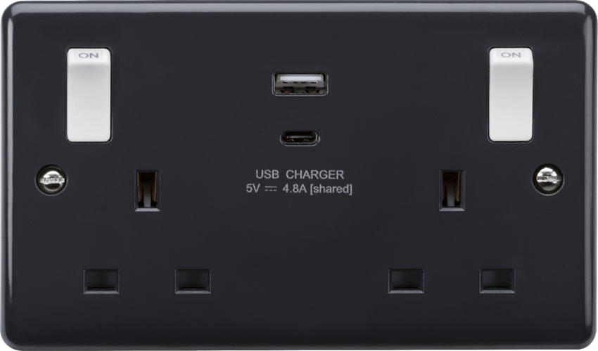 13A 2 Gang Double Pole Switched Socket with Dual USB Type A and Type C with Outboard Rockers.