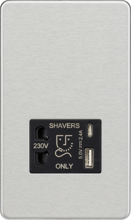 Knightsbridge Screwless SF8909BC Dual USB Single Voltage Shaver Socket (USB A+ C) - Brushed Chrome - Black Insert