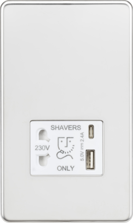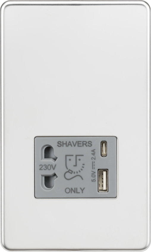 Knightsbridge Screwless SF8909PCG Dual USB Single Voltage Shaver Socket (USB A+ C) - Polished Chrome - Grey Insert
