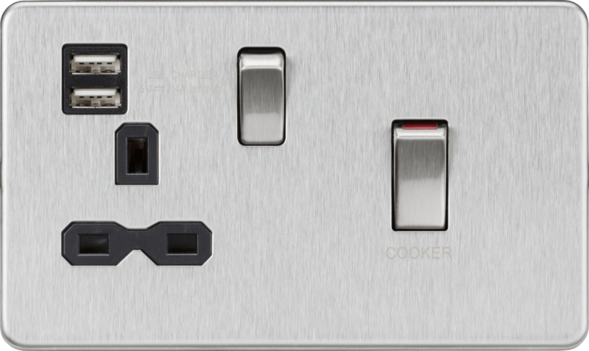 Knightsbridge Screwless SFR83UMBC 45A DP Switch & 13A Switched Socket with Dual USB Charger - Brushed Chrome - Black Insert