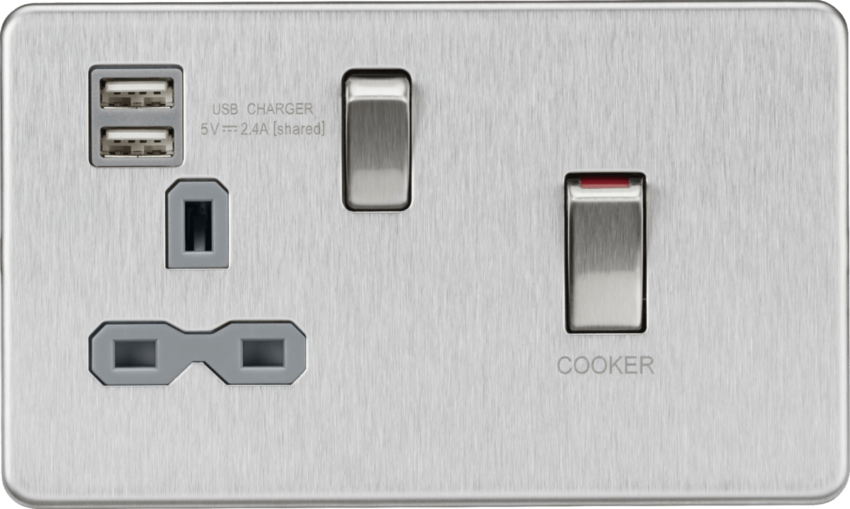 Knightsbridge Screwless SFR83UMBCG 45A DP Switch & 13A Switched Socket with Dual USB Charger - Brushed Chrome - Grey Insert