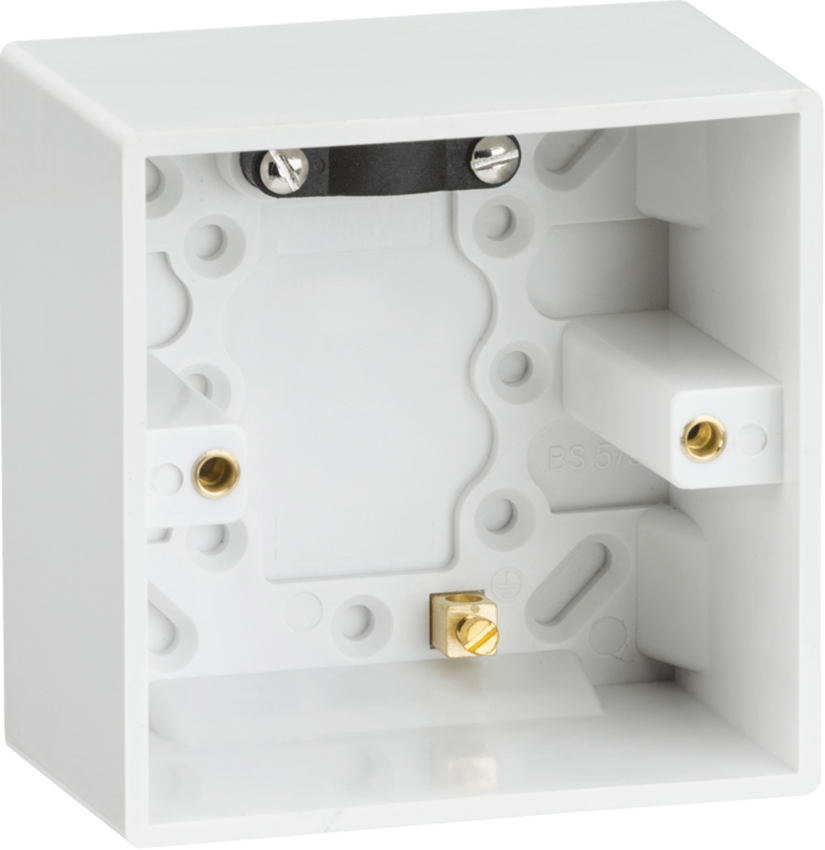 Knightsbridge's Square Edge for use with the square edge range. Single 47mm Pattress Box with Earth Terminal. General Information Plate Dimensions: 86mm (W) x 86mm (H) x 52mm (D) Manufacture ... Read More