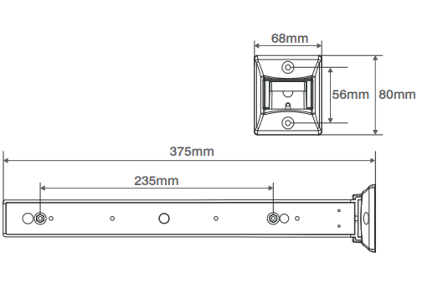 - Dimensions: 375mm (L) x 35mm (W). Base Dimensions 68mm (W) x 80mm (H). Fixing Centres 56mm.