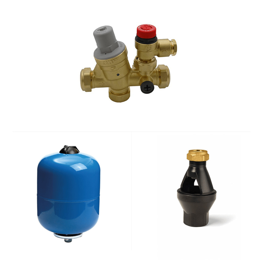 A mandatory installation kit for all models of Rointe Rome, Siena and Geneva unvented domestic water heaters. Consists of a pressure-reducing and relief valve, expansion vessel and tundish.
