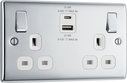 BG Nexus NPC22UAC12W Double Socket 13A with 12W Type A + C USB - Polished Chrome