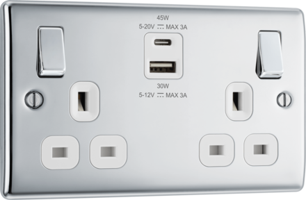 BG Nexus NPC22UAC45W Double Socket 13A with 45W Type A + C USB - Polished Chrome
