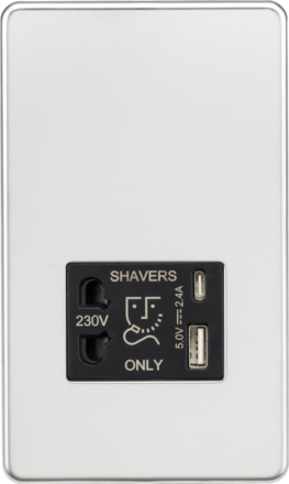 Knightsbridge Screwless SF8909PC Dual USB Single Voltage Shaver Socket (USB A+ C) - Polished Chrome - Black Insert
