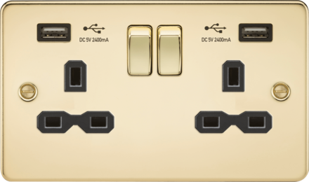 Knightsbridge Flat Plate FPR9224PB 13A 2G Switched Socket with Dual USB Charger (A.A) PB - Black Insert