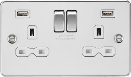 Knightsbridge Flat Plate FPR9224PCW 13A 2G Switched Socket with Dual USB Charger (A+A) PC -White Insert