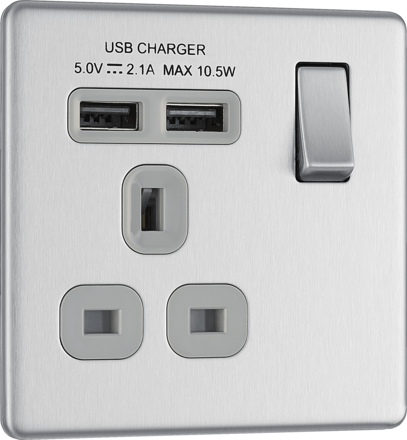 BG Flatplate FBS21U2G Screwless 1G 2USB 2.1A Switched Socket - Brushed Steel