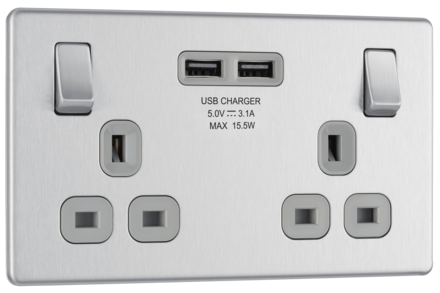 BG Flatplate FBS22U3G Screwless 2G 2USB 3.1A Switched Socket - Brushed Steel